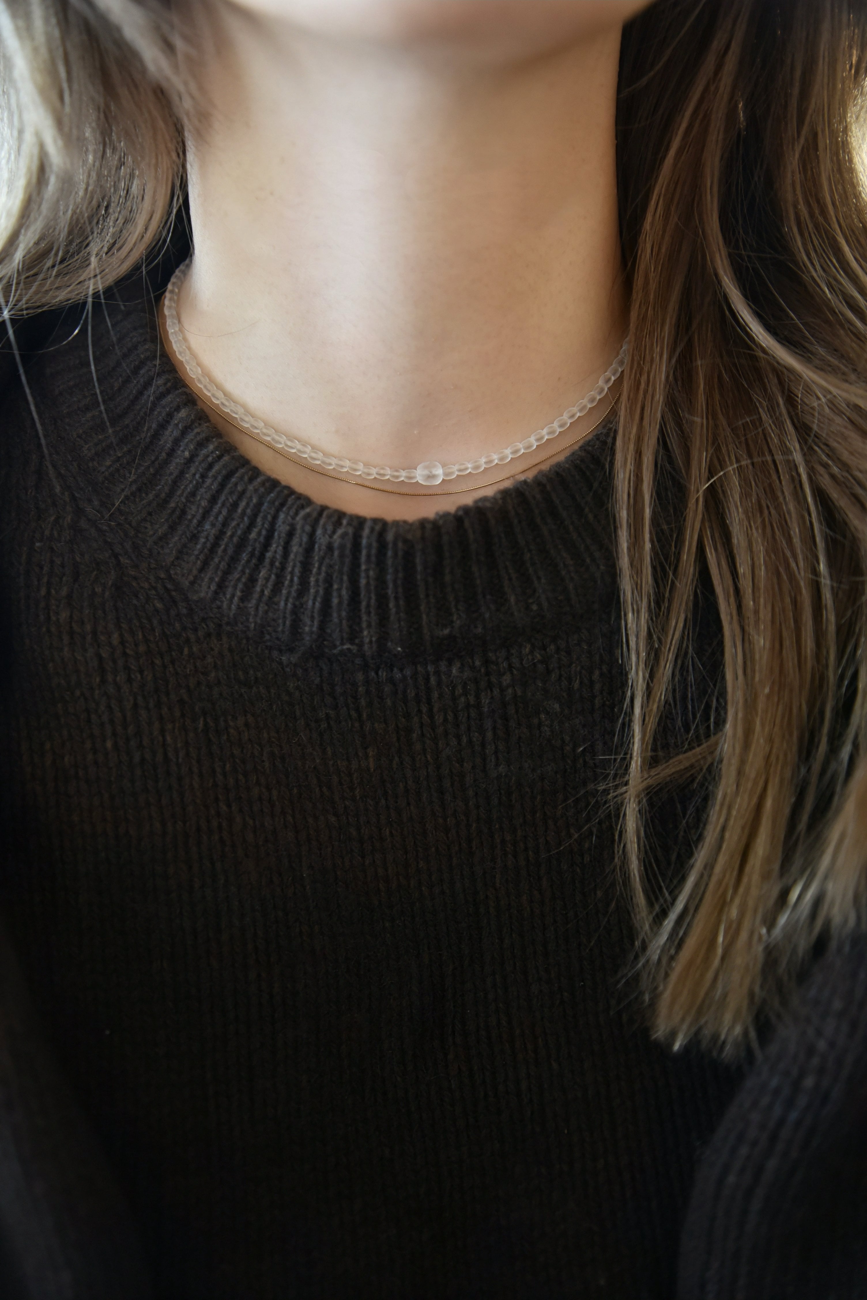 首周りを華やかに演出するチェコビーズのチョーカーネックレスです。豊かな色合いのチェコビーズが、軽やかな付け心地と共に存在感を放ち、洗練された印象を与えます。デザイン性に富んだお洋服とも見事に調和し、スタイルに一層の深みを加えてくれることでしょう。 お手持ちのジュエリーと組み合わせることで、さまざまなシーンでの新しい表情を楽しむことができます。